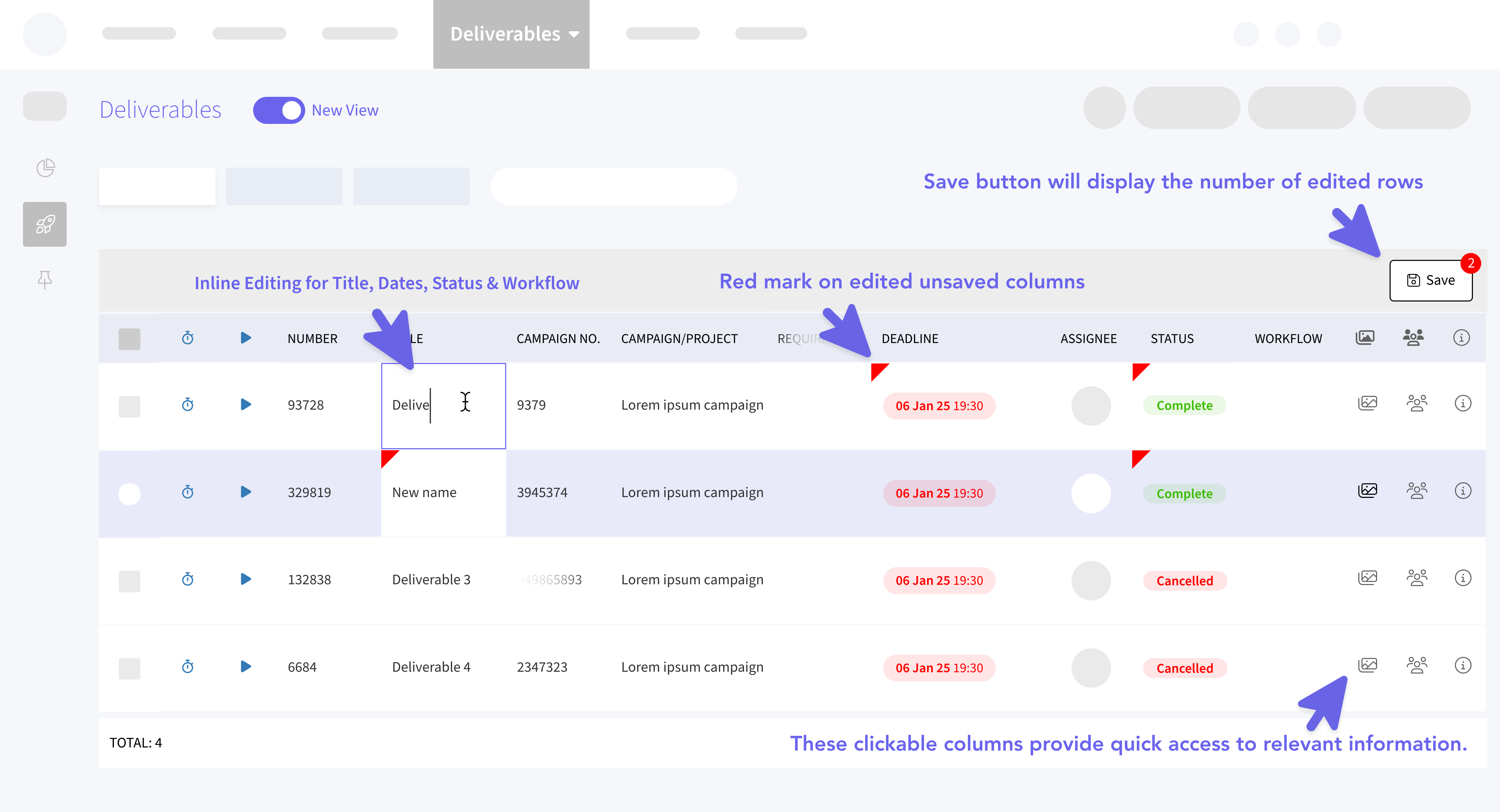 You can now edit deliverables right from the list view! No more jumping into individual records. Just click and change the Title, Dates, Status, or Workflow inline. You’ll see a red mark on edited columns, and a save button will display the number of edited rows. (Currently only available to users with the new view under BETA)
