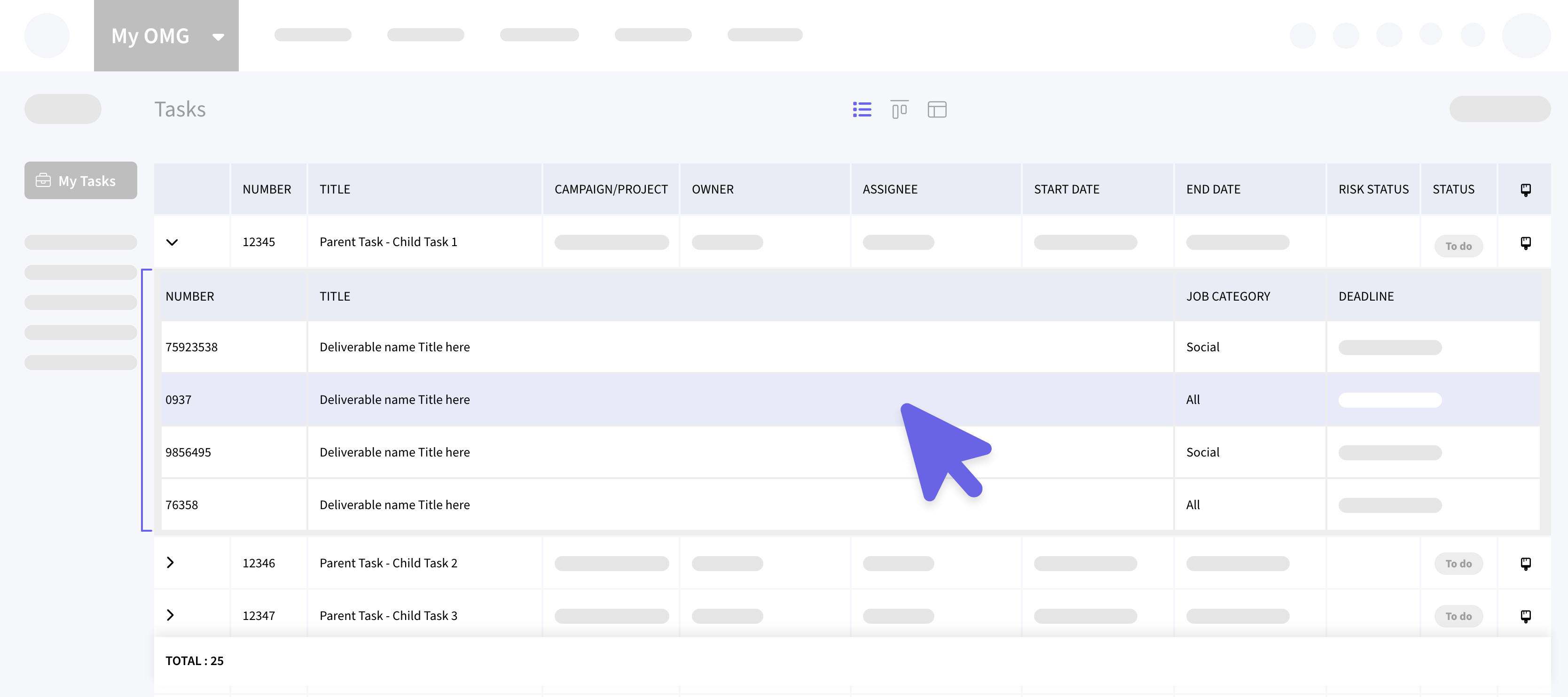 Click the expand icon next to a task to open a sub-grid showing the associated deliverables. The sub-grid also supports sorting and filtering, so you can easily organise and view the linked items.
