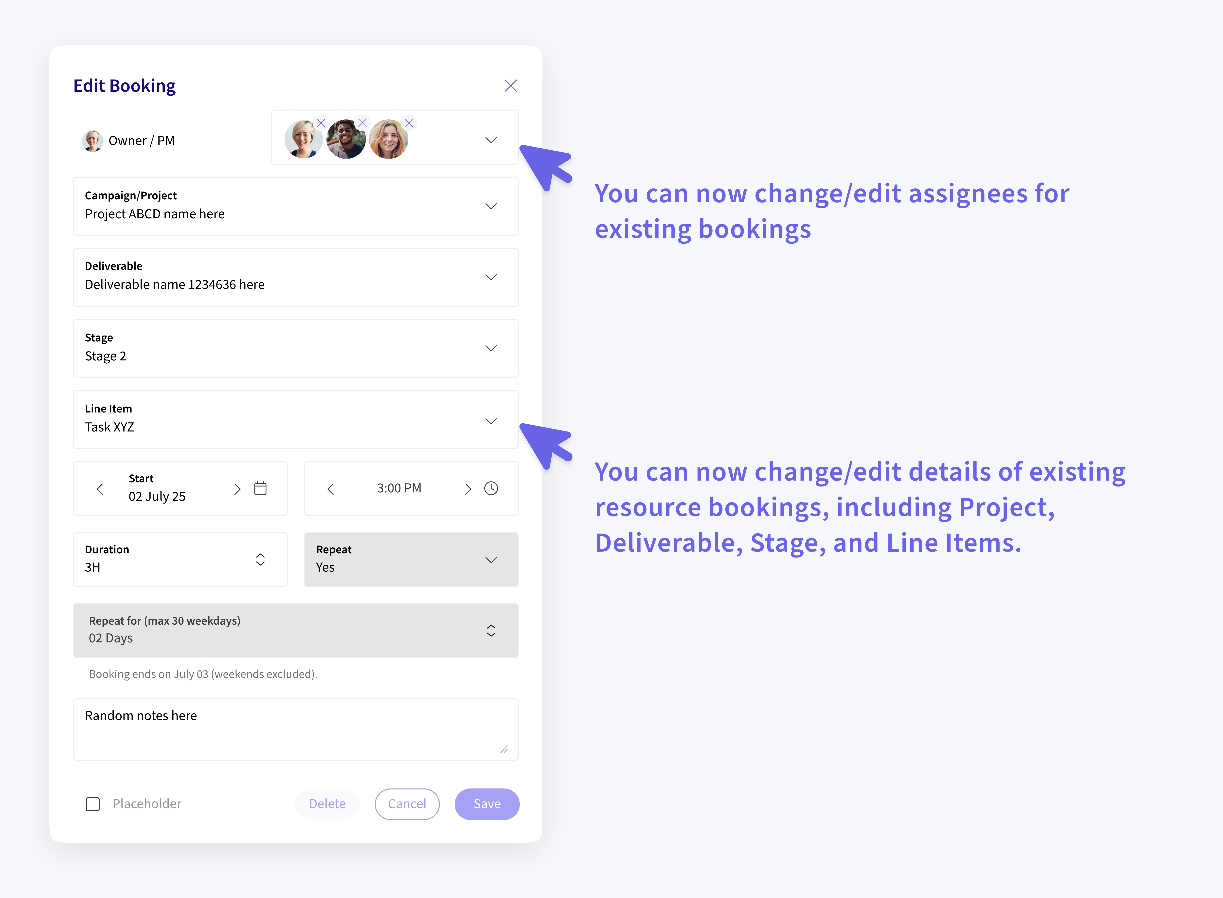 Users can now edit details of existing resource bookings, including Project, Deliverable, Stage, and Line Items, for both single and series bookings. All changes are reflected immediately upon saving.